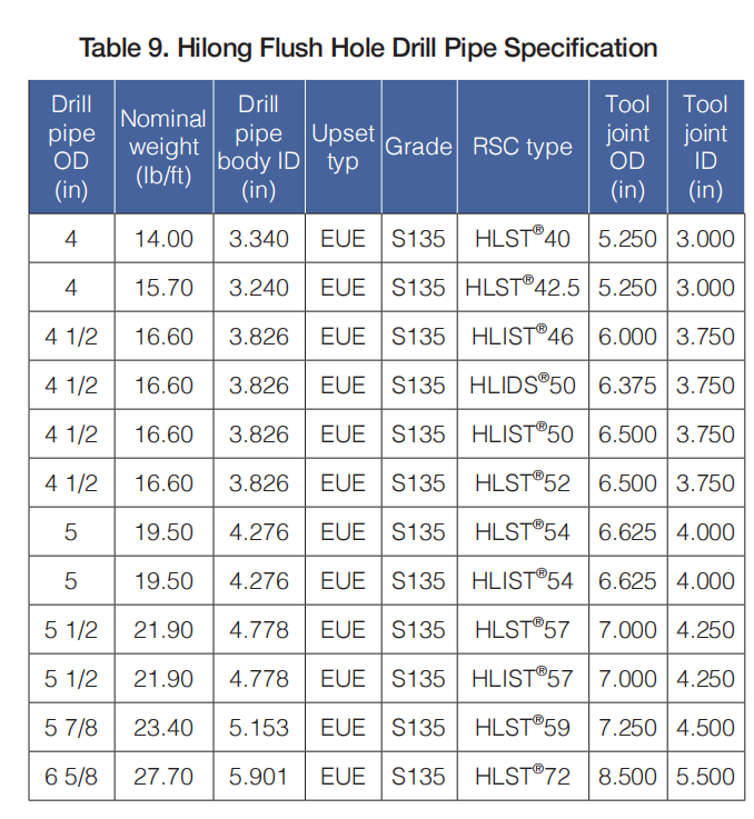 Decreasing the hydro pressure loss to improve the hydro-efficiency is the key to improve drilling speed. Shanghai Hilong's proprietary flush-hole drill pipe is designed to be made-up with the drill pipe body using a special external upset with a large ID and the tool joint with Hilong double shouldered connections with a large ID also. The ID of the upset end and the tool joint are almost the same as that of the drill pipe body.
